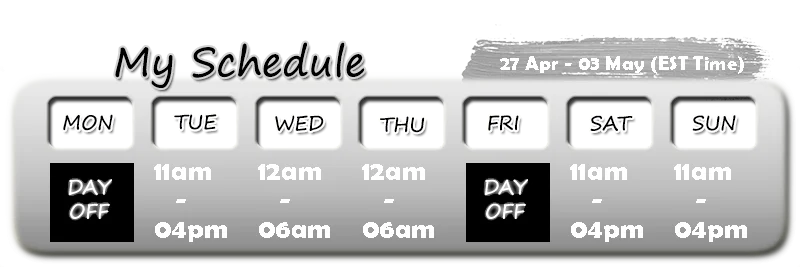 Hi dear =) Please check my new schedule and wait you on my streams ;*** Don't forget follow me c======3